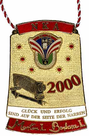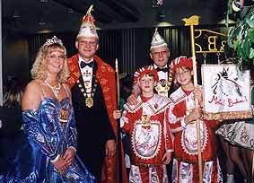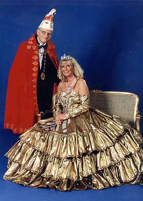 Der diesjährige Prinzenorden ist ganz in gold gehalten und mit sechs funkelnden Steinen – sie sollen die Zugehörigkeit der sechs Neunkircher Karnevalsvereine zum NKA darstellen – verziert. In der Mitte findet man das Wappen des NKA, etwas weiter unten rechts die Zahl 2000 und links davon eine Kamera die den Beruf der Prinzessin (Fotografenmeisterin) widerspiegeln soll. Am unteren Teil ist das Motto des Prinzenpaares der Session 1999/2000 – „Glück und Erfolg sind auf der Seite der Narren“ – eingedruckt. Zwischendurch und am Ende der Verleihung spielten die Katastrophoniker, eine schon sehr bekannte Musikgruppe aus dem Verein des KV Eulenspiegel und brachten eine riesen Stimmung in den Saal. Der NKA (Neunkircher Karnevals Ausschuss) vertritt folgende 6 Vereine: Eulenspiegel, Rote Funken, Daaler, Plätsch, KKW Wellesweiler und KUV Wiebelskirchen. Diese Vereine haben zusammen ein Prinzenpaar, das dadurch natürlich während der Session sehr viele Veranstaltungen besucht. Unser diesjähriges Prinzenpaar Martin I. und Barbara I. ist vielen schon recht bekannt; besonders die Prinzessin, denn sie ist Inhaberin des inzwischen sehr populären Fotostudio Barbara Schreiner in Furpach, das sich mit wunderschönen Portraits, Freundlichkeit und sehr gutem Service einen Namen gemacht hat. Ein wenig wollten wir noch hinter die Kulissen schauen, und so haben wir das Prinzenpaar zu Hause besucht. Zuerst begrüßen uns 3 fröhliche Dackel und wir haben Mühe, in die Wohnung zu kommen. Das Prinzenpaar ist sehr tierlieb. Überall hängen Hunde- und Kinderfotos; die beiden Kinder des Paares Stephanie Christine (13 Jahre) und Christian Alexander (10 Jahre) werden als Knappen so oft wie möglich an den Veranstaltungen teilnehmen. Beide sind sehr gut in der Schule, berichtet die Prinzessin, so das die vielen Termine wohl kein Problem sein dürften. Prinzessin Barbara ist 38 Jahre alt, von Beruf Fotografenmeisterin, nach eigenen Worten keine gute Köchin, aber praktisch sehr begabt. Ihre 4 Prinzessinnenkleider und die Knappenkostüme der Kinder hat sie selbst entworfen und genäht. Sie schreibt die Reden für alle Auftritte und gestaltete den Prinzenorden. Barbara I. liebt Kinder und Tiere, besonders Delphine, Elefanten und Hunde, ihre Lieblingsstadt ist London, aber sonst mag sie im Urlaub am liebsten Palmen und den maurischen Baustil. Sie ist laut Aussage ihres Prinzen lebhaft, optimistisch und immer gut gelaunt. Prinz Martin, ebenfalls 38 Jahre alt, ist der ruhende Pol im Hause Schreiner. Von Beruf Dipl. Ing der Elektrotechnik und Dipl. Wirtschfts-Ingenieur, arbeitet er bei Saar Energie als Beauftragter für Unternehmenskommunikation. Er kocht gerne und gut, kauft selber ein und was seine Barbara sehr schätzt, er ist ein Mann, der nach dem Kochen die Küche wieder in Ordnung bringt. Martin I. repariert so ziemlich alles was im Hause kaputt geht, ist sehr geduldig und zuverlässig. Beide tanzen gerne und lieben gesellige Abende. Der Fahrer des Prinzenpaares, Lothar Ackermann, 44 Jahre, verheiratet, zwei erwachsene Kinder und ein kleiner Mischlingshund, ist Schlagzeuger der oben genannten Katasthrophoniker. Natürlich ist sein Hobby die Musik, er ist begeisterter Skifahrer, Angler und er ist ebenso tierlieb wie die Prinzessin. Und für das Prinzenpaar ist er einer der nettesten Menschen. |