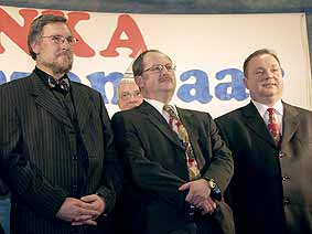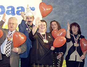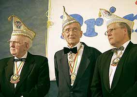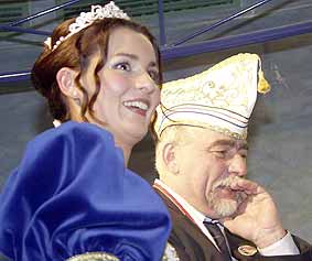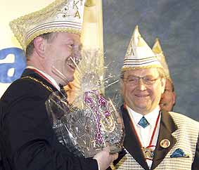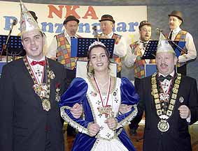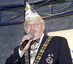 Nach dem Einmarsch des sympathischen Prinzenpaares stellte Karl Albert gekonnt die Tollitäten der Neunkircher Faasenacht dem närrischen Volk etwas näher vor. Prinz Sascha I., der im wirklichen Leben Sascha Vogler heißt, verdient sein Geld als Energieanlagen-Elektroniker. Seine Prinzessin Anja I. heißt mit richtigem Namen Anja Rinke und ist von Beruf Kauffrau für Bürokommunikation. Sie hatten sich vor ca. neun Jahren in der Tanzschule Denne kennen und lieben gelernt. Der Vorschlag, die Beiden zum neuen Prinzenpaar zu küren, stammte von der Wirtin des Stadtbad-Restaurants und Ehrenrätin des Karnevalsvereins „Die Daaler“, Doris Schmelzer. Als nun nach neuen Regenten gesucht wurde, fiel ihr sofort die Tochter des Neunkircher Metzgermeisters und ihres Ehrenratskollegen Heinz Rinke ein. Als Anja diese Nachricht von ihrem Vater erfuhr, ging für sie ein Kindheitstraum in Erfüllung. Auch ihr Freund Sascha musste nicht lange überzeugt werden, dieses Ehrenamt anzutreten. Ihre Herrschaft soll unter dem Motto „Herzen frei der Narretei“ stehen. „Wir wollen regieren mit Freude, Frohsinn und Herz, erwarten von den Narren viel Knepp und viel Ferz“, so etwa begann die Rede des immer strahlenden Prinzenpaares, die dafür auch den wohlverdienten Applaus vom Publikum erhielten. Symbolisch hielten die Regenten der Neunkircher Faasenacht Luftballon-Herzen in einer Hand, die sie an diesem Abend in Verbindung mit der Verleihung des diesjährigen Sessions-Orden und der Prinzennadel verschenkten. Im Anschluss stellte der NKA-Präsident unterhaltsam den Sessionsorden vor. Zwei große goldene Herzen, zusammengehalten und umschlungen von zwei Schleifen in den Farben der Neunkircher Fassenacht, rot und weiss. In der unteren Schleife ist das Motto der Session „Herzen frei der Narretei“ eingeprägt. Das linke Herz trägt das Wappen des NKA’s (NKA-Eule mit Neunkircher Stadtwappen, sowie dem närrischen Gruß „Hei-Joo)“. Das rechte Herz trägt die Namen des diesjährigen Prinzenpaares. Im oberen rechten Teil des Herzens ragt ein Clown in den Farben der Brudervereine heraus, der in beiden Händen je ein grünes und blaues Herz hält, was symbolisch heißen soll, dass er an alle Narren sein Herz verschenkt. Der Zylinder des Clowns trägt das Logo der Kreisstadt Neunkirchen, was den Neunkircher Karneval symbolisiert. Im linken oberen Teil findet man zwei kleine überlagerte Herzen, eines in rot das andere in weiss, mit der eingeprägten Jahreszahl 2003. Danach vollzog man die Verleihung der ersten Sessionsorden und des Vorjahresorden. Gleich drei neue Senatoren (Sponsoren und Repräsentanten des NKA) wurden an diesem Abend ernannt. Zoodirektor Dr. Norbert Fritsch, NVG-Vorstand Pascal Koch, (die Chefs städtischer Tochtergesellschaften, oder auch auf lustige Weise von Karl Albert als „die Schwiegersöhne vom OB“ bezeichnet), sowie Dipl.-Ing. Matthias Martin (Heizungsbau Martin GmbH), erhielten ihre Narrenkappen und Orden. Geehrt für 11 Jahre Senator im NKA wurden der Gärtnermeister Franz-Wilhelm Knichel (Gartenbau Knichel) und Vorstandsvorsitzender der Sparkasse Neunkirchen Volker Groß. Er war bereits im Jahr 2000 elf Jahre Senator beim Neunkircher Karneval Auschuss, war aber aus beruflichen Gründen zwei Mal bei der Verleihung verhindert. Aus diesem Grund wurde ihm dieses Jahr der Eulenorden an silberner Kette samt Urkunde überreicht. Fast alle Orden der Neunkircher Faasenacht hat Wilhelm Knichel, der lange Jahre als aktiver Büttenredner aktiv war, schon erhalten. Für langjährige Tätigkeit bei seinem Karnevalsverein „Rote Funken“ wurde er bereits mit dem Eulenorden an silberner Kette ausgezeichnet, deshalb überreichte ihm der NKA-Präsident für seine 11-jährige Senatortätigkeit als Präsent eine silberne Uhr. Bevor es nun mit Eulenorden an silberner Kette, der Verleihung des NKA-Eulenorden, sowie des NKA-Sessionsordens an neue Eulenordensträger der Bruderverein weiterging, unterhielten die Promillos vom KKW das närrische Volk mit stimmungsvollem Gesang. Ausgezeichnet für langjährige und besondere Verdienste in ihrem Verein wurden bei den „Die Daaler“ Ramona Karthein und Arianne Edelmann. Bei dem Furpacher Karnevalsverein „Eulenspiegel“ wurden Heike Ziegler und Kurt Dupré ausgezeichnet. Orden und Urkunde erhielten auch Melanie Ruffing und Melanie Lieblang, die der Präsident des KKW Elmar Schneider – in gekonnter Manier – ins rechte Licht rückte. Beim KUV erhielten Bernd Klein, bei der „Neinkerjer Plätsch“ Silke Schwenk und Serap Völker sowie bei den „Roten Funken“ Hedi Greif den Eulenorden an silberner Kette. Danach wurde sich zuerst mal mit heißen Wienern (natürlich von der Metzgerei Rinke gesponsert) und einem gut gekühlten Bier (gesponsert von SWG und KEW) gestärkt. Im Anschluss wurden die NKA-Präsidums Ehrenordensträger, der VSK-Vertreter (Verband Saarländischer Karnevalsvereine) Horst Wagner, die Pressevertreter, Repräsentanten aus Wirtschaft und Verwaltung, sowie das NKA-Präsidium, Vereinspräsidenten und weitere Personen mit dem diesjährigen NKA-Sessionsorden ausgezeichnet. Zum Abschluss des gelungenen Abends bereiteten die Promillios mit einer musikalischen Einlage das Publikum auf die kommende närrische Zeit vor. |