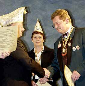 Mit einem herzlichen Händedruck empfingen Prinz Zoran I. und ihre Lieblichkeit Daniela I. bereits am Eingang zahlreiche Narren der Brudervereine des Neunkircher Karnevalsausschusses (NKA) sowie jede Menge Prominenz aus Politik und Wirtschaft. NKA-Präsident Karl Albert tat es den Beiden gleich. Auch wenn die ersten „Heijo“ und „Alleh Hopp“ noch etwas schwerfällig klangen, legte Moderator Albert mit Vollgas los und riss das Volk im Dieter Thomas Heck-Tempo mit. So präsentierte er sogleich das Motto der Session „Mit Vollgas dorsch die Faasenacht“ und stellte dann das „närrische Dreigestirn“, Prinzenpaar und Hofmarschall Dieter Fritz, vor. Die Tollitäten Zoran I. und Daniela I. berichteten folgend in Reimform und mit vielen witzigen Wortspielereien von ihren vielfältigen Prinzenpflichten. Was wäre diese Veranstaltung ohne Prinzenorden? Originell gestaltet zeigt das gute Stück mittig einen NVG-Bus, auf dem es sich ein Narr in den NKA-Farben gemütlich gemacht hat vor den goldenen Umrissen des Landkreises. Der Clou: Als Anhängsel besitzt das schmückende Objekt ein kleines NKA-Wappen, das sich gut in einen Schlüsselanhänger umfunktionieren lässt. Zum Piercen sei es wohl weniger geeignet, meinte dazu Karl Albert scherzhaft. Selbstverständlich zählten er und das Prinzenpaar zu den ersten Trägern des begehrten Objektes, den sonst noch die Vertreter aus Politik, Wirtschaft und Presse erhielten. Auch im weiteren Verlauf drehte sich fast alles um Auszeichnungen. Nicht alltäglich ist sie und nur besonders verdiente Personen können sich über „eine ganz besondere Würdigung“, wie es Wilfried John ausdrückte, und der Auszeichnung mit einem Präsidiumsehrenorden freuen. An diesem Abend waren es vier herausragende Persönlichkeiten, die für ihre über 22-jährige Tätigkeit innerhalb des NKA darüber hinaus noch eine schöne Urkunde und eine würdige Laudatio vom ehemaligen NKA-Präsidenten erhielten. Verdient hat ihn sich zum einen die langjährige „Protokolaria“ (die Wortschöpfung stammt von August Weirich) Heidi Eiden vom Karnevalsverein Rote Funken für ihre langjährige ehrenamtliche Tätigkeit. Der von John als „Hüter des verlorenen Schatzes“ betitelte Ralf Beckhäuser, seines Amtes Elferratspräsident des Karnevalsvereins Die Daaler und Schatzmeister des NKA, war der zweite im Bunde. Ihm hielt John zugute, dass er in diesem Amt einen „langen dornenreichen Weg“ bestritten habe. Darüber hinaus ist Beckhäuser schon seit Kindesbeinen ein fester Bestandteil der Neunkircher „Faasenacht“. Bekannt als „Schaffer“ ist der ehemalige Organisationsleiter des NKA, Harald Loch, der lange Zeit den Rosenmontagsumzug leitete. John lobte vor allem Lochs Zuverlässigkeit und seinen persönlichen Einsatz im NKA. Stehende Ovationen erhielt Robert Gerbracht, bekannt als „Obbi“ für sein Lebenswerk. In gewohnt trockener Manier reagierte er auf den Applaus mit dem Satz: „Das enzische Geräusch, dass ich gerne heere“. Als besondere Charakterzüge des Neunkircher Originals gelten laut John: „Er ist ein Typ ohne Allüren, der die Menschen zum Lachen bringt.“ Ihn zeichnet auch seine Tätigkeit als Archivar beim NKA aus. Bei dem Büttenredner des KKW Wellesweiler, der schon in so vielen Rollen steckte, sei der Begriff „Urgestein der Neunkircher Faasenacht“ wirklich angebracht, hieß es in der Laudatio. Musikalische Stimmung in den Saal zauberten die Promillos vom KKW, die kürzlich den Saarlandmeistertitel im karnevalistischen Liedgut beim VSK-Liedwettbewerb gewannen. Wie es bei Prinzenempfängen so üblich ist, wurden auch diesmal verdiente Mitglieder der NKA-Vereine bedacht. Mit dem Eulenorden an silberner Kette wurden für ihre aktive Tätigkeit im Karneval ausgezeichnet: Silke Deutsch und Gisela Menzer (Die Daaler), Frank Wagner und Tina Strauß (Eulenspiegel), Andrea Eisenbeis und Kerstin Spieß (KKW Wellesweiler), Ilse Borkowski und Irene Klein (KUV Blau-Gelb Wiebelskirchen), Elke Ruffing, Ulla Ruffing und Monika Hermann (Neinkerjer Plätsch), Sandra Koch und Laura Ruffing (Rote Funken). Gegen Ende der Veranstaltung durften sich die Gäste noch über die gesponserten Wiener (vom Metzgermeister Rinke) und Weck (Bäckerei Wolfgang Kühn) freuen. Die Einmannkapelle mit Frank Grub am Keyboard untermalte die Veranstaltung mit karnevalistischer Musik. |