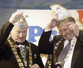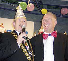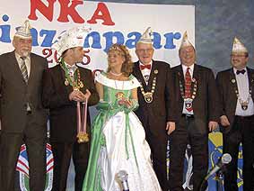 Herzlich empfing das neue Prinzenpaar Dirk I. und Gaby I. die Gäste aus den Neunkircher Karnevalsvereinen, sowie der Politik, Wirtschaft und Presse. Vorgestellt wurden die beiden Tollitäten vom Vorsitzenden ihres Vereines, Ralf Beckhäuser vom KV Die Daaler. In dieser Session wollen es Gaby und Dirk so richtig krachen lassen. Zumindest verspricht dies ihr Motto: „Narren lasst es krachen, lasst es beben in Neinkerje, der Stadt zum Leben.“ Verkörpert wird dieser Leitspruch auch im originellen NKA-Sessionsorden. Er zeigt die Prinzessin, von Beruf Verkäuferin, wie sie fröhlich ihren Gatten im Einkaufswagen vor sich her schiebt. Als Anspielung auf seinen Job bei der Stadt Neunkirchen schwingt der gelernte Schlosser, alias Dirk I., dabei eine Rohrzange. Deutlich kann man noch sein Markenzeichen, den Zopf am Hinterkopf, erkennen. Das Prinzenpaar, das von ihrem Fahrer Lothar Schmitt begleitet wurde, bedankte sich auch bei seinen Sponsoren und Helfern wie dem Autohaus Hanschke & Harsch, das den Prinzenwagen stellte oder Christa Schmitt, die in stundenlanger Arbeit das tolle Kleid der Prinzessin nähte und mit hunderten von Pailletten bestickte. Der neue Sessionsorden wechselte zu allen NKA-Präsidiums-Ehrenordenträgern, den Vertretern des Verbandes saarländischer Karnevalsvereine (VSK), den Pressevertretern, den Repräsentanten aus Wirtschaft und Verwaltung, an das NKA-Präsidium und weitere verdiente anwesende Personen. Für eine Überraschung sorgte die Verleihung eines ganz besonderen Ordens. Der NKA-Vorsitzende Karl Albert überreichte diesen stolz den Vorsitzenden der Neunkircher Karnevalsvereine, dem Oberbürgermeister von Neunkirchen und dem Prinzenpaar. Ein Paket gefüllt mit den glänzenden Anhängern hatte einen weiten Weg hinter sich, denn es kam aus Milwaukee/Wisconsin (USA). Geschickt von einem saarländischen Ehepaar, das dem dortigen „Rheinischen Verein Grün-Weiß“ angehört. Der Orden trug die sinnige Inschrift „Karneval macht Freu(n)de“. Es war eine gelungene Überraschung und eine schöne Geste dazu. In den Kreis der Senatoren aufgenommen wurde Direktor Heinz Neis von der Bank 1 Saar, von Albert scherzhaft als „Heinz der Mächtige“ bezeichnet. Der Uhu im NKA-Wappen ist ein Symbol für Weisheit und Klugheit. Genauso majestätisch, edel und weise wie sein Lieblingstier der „Bubu“ solle Karl Albert sein Amt als NKA-Präsident ausführen, wünschte sich sein Vorgänger Winfried John und ehrte Albert mit dem NKA-Eulenorden für sein bisheriges Tun. Den erhielten auch Isabelle Szumlinski und Uwe Wagner vom Karnevalsverein Die Daaler, Uwe Ruppenthal und Bernhard Fries vom KV Eulenspiegel Furpach, Andrea Bender und Uwe Henniger vom KK Wellesweiler, Uschi Jung und Peter Friedrich vom KUV Wiebelskirchen, Mark Schaufert vom KV Die Plätsch und von den Roten Funken Ronja Cornely, Olaf Rammo und Alexander Müller. Für ihre langjährige Mitgliedschaft und tatkräftige Vereinsarbeit, sei es hinter oder auf der Bühne, lobten ihre Vorsitzenden sie vor den Anwesenden. Ob Büttenredner, Elferratsmitglied, Gardetänzer(in) oder Trainerin – alle hatten sie sich durch ihre jahrelange ehrenamtliche Arbeit diese Auszeichnung redlich verdient. Zum Schluss des offiziellen Teils der Veranstaltung sorgte Adolf Müller, der seit einem Wettbewerb in der Sendung „Verstehen Sie Spaß?“ den Titel „Witzbold des Jahres“ trägt, noch einmal für Heiterkeit. Gekonnt präsentierte „De Saarländer von de Plandaasch“ wie er auch genannt wird, einen zungenbrecherischen Gag und bewies allen, dass er seinen Titel zu Recht trägt. Für stilgerechte Fasenachtsmusik sorgte das beliebte Stimmungsensemble „Die Promillos“, die sich schon in etlichen Lied-Wettbewerben erfolgreich behauptet haben. |
