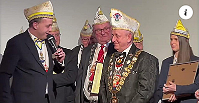 So hat sich Anfang Januar des Jahres 2025 beim NKA-Prinzenpaar- und Ordensempfang mancher in der Faasenacht nicht so beheimateter Gast gefragt. Viele Faasenachter haben gegrinst: „So heischd`er also“. Sehr schnell wussten aber alle, dass „de Friedel“ gemeint war, als der VSK-Präsident ihn mit vollem Namen nannte und zu sich in den Kreis der NKA-Senatoren und anderen Ehrengästen auf die Bühne bat.